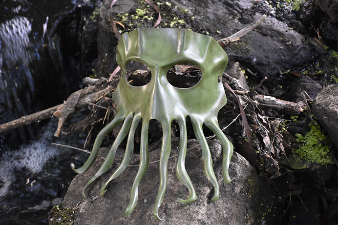 A mask depicting the mysterious and tentacled menace dwelling beneath the waves: the Kraken! Hand-shaped from leather and painted with acrylics. Comes laced with brown ribbons.