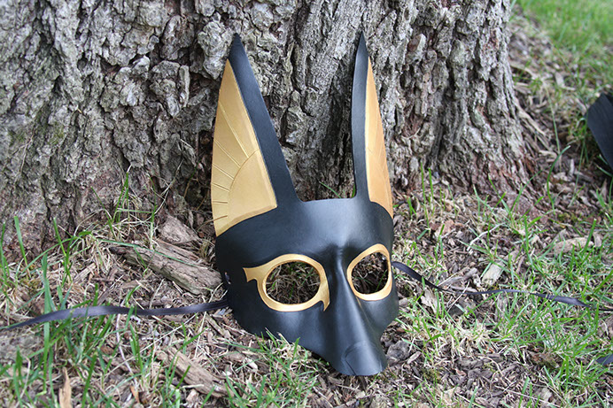 A classic mask resembling Anubis, the ancient Egyptian God of Death! Hand-shaped from leather and painted with acrylics. Comes laced with black ribbons.