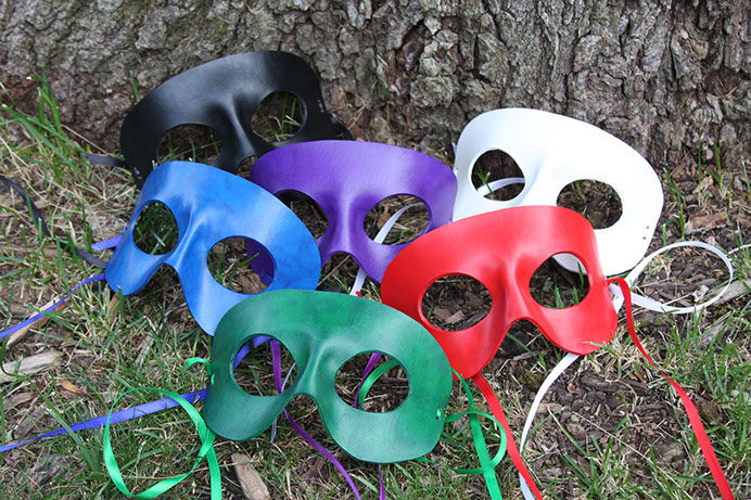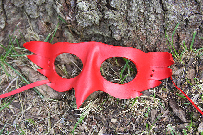 A simple little mask that looks good in any color. Hand-shaped from leather and painted with acrylics. Comes laced with ribbons of a similar color.