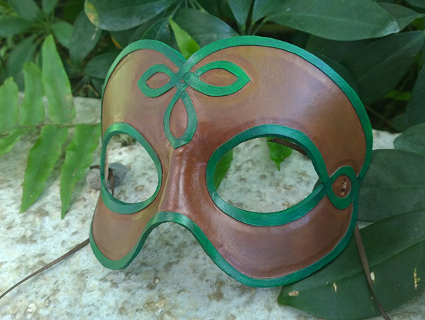 A mask that puts the beauty of nature right on your face! Hand-shaped from leather and painted with acrylics. Comes laced with green ribbons.