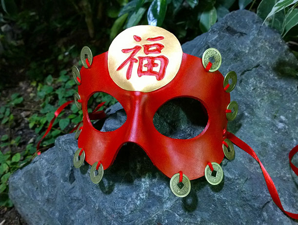 A mask showcasing the Fú character and a number of laced-on metal coins, with both of these being traditional Chinese symbols for luck and fortune! Hand-shaped from leather, painted with acrylics, and featuring metal coins. Comes laced with red ribbons.