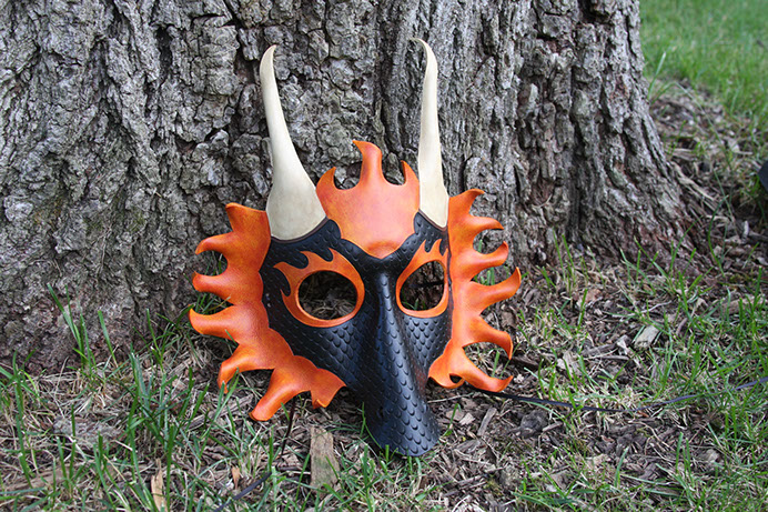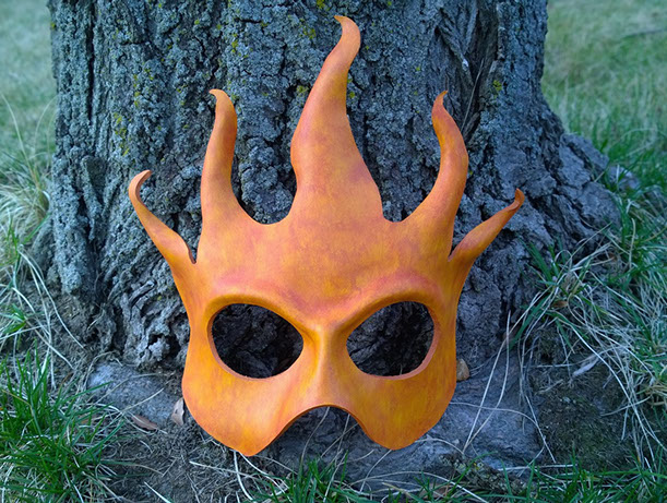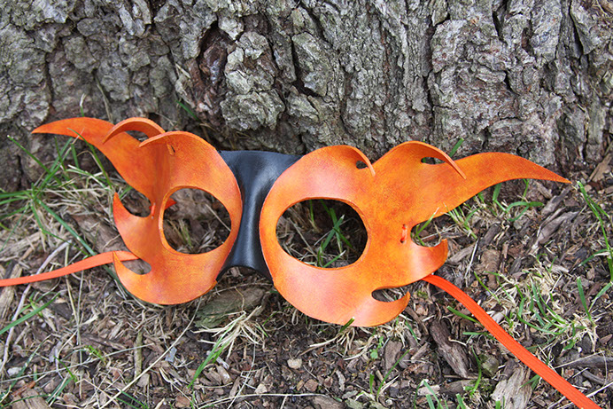 A fun mask with a bright flame raging from each eye! Hand-shaped from leather and painted with acrylics. Comes laced with orange ribbons.