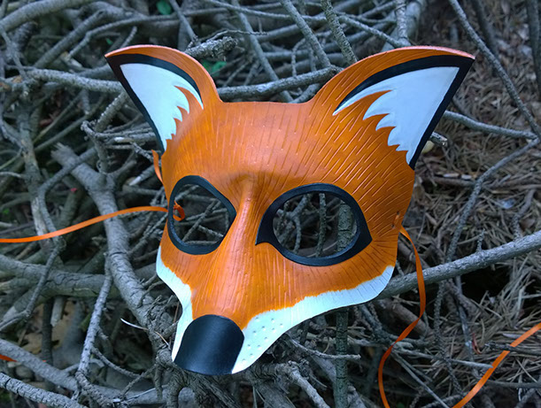 A mask resembling the adorable snout and ears of a cunning fox! Hand-shaped from leather and painted with acrylics. Comes laced with orange ribbons.