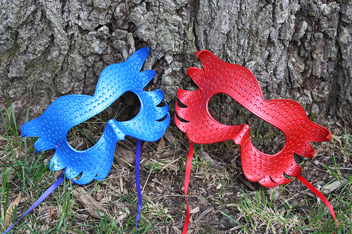 A mask showing the fearsome face of a little dragon! Hand-shaped from leather and painted with acrylics. Comes laced with ribbons of a similar color.