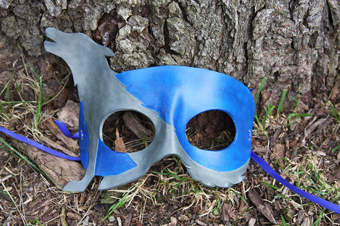 A mask featuring the silhouette of a howling wolf! Hand-shaped from leather and painted with acrylics. Comes laced with blue ribbons.