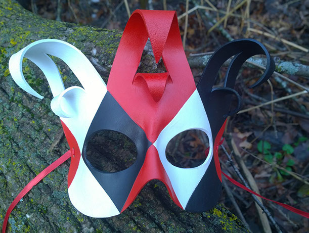 A classic mask design fit for any fool! Hand-shaped from leather and painted with acrylics. Comes laced with ribbons of an appropriate color.