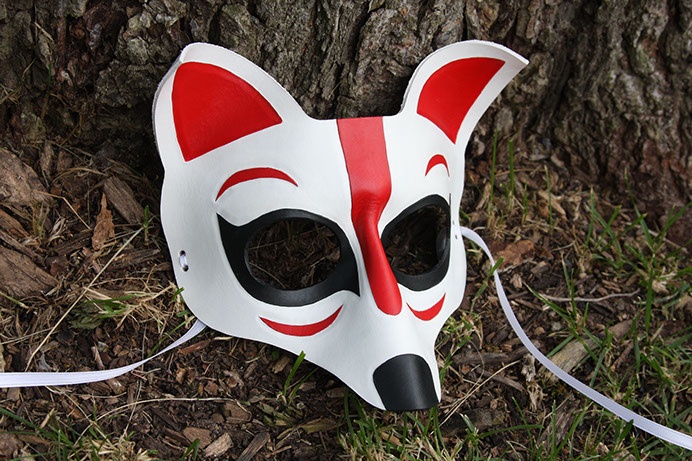 A fox mask designed after traditional Japanese kabuki masks! Hand-shaped from leather and painted with acrylics. Comes laced with white ribbons.
