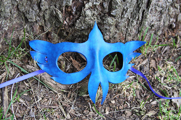 A mask showing off the beautiful wings of the blue morpho butterfly! Hand-shaped from leather and painted with acrylics. Comes laced with blue ribbons (not shown).