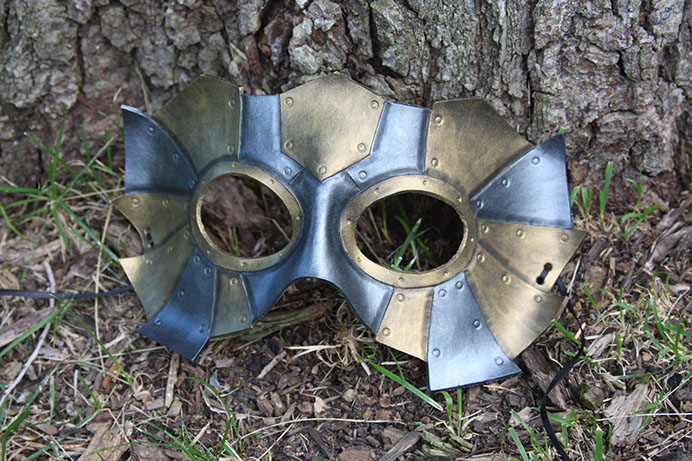 A half-mechanical mask with a bit of steampunk flair. Hand-shaped from leather and painted with acrylics. Comes laced with brown ribbons.