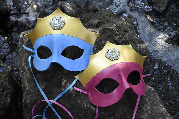 A regal mask set with an ornate jewel fit for any princess! Hand-shaped from leather and painted with acrylics. Comes laced with ribbons of a similar color.