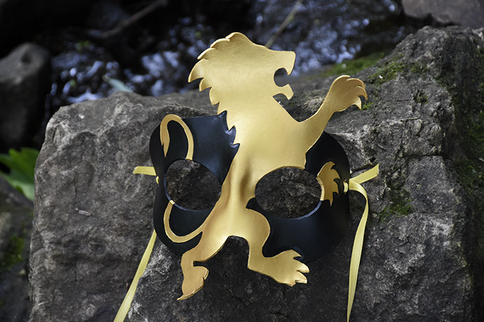 A heraldry mask featuring the golden silhouette of a rampant lion! Hand-shaped from leather and painted with acrylics. Comes laced with yellow ribbons.