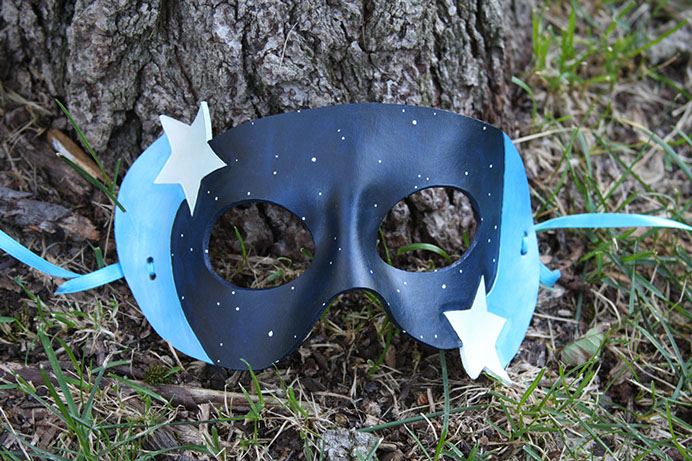A fun mask showing the night sky and a few shooting stars! Hand-shaped from leather and painted with acrylics. Comes laced with blue ribbons.