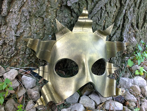 A mask in the shape of a tarnished gold sun! Hand-shaped from leather and painted with acrylics. Comes laced with black ribbons (not shown).