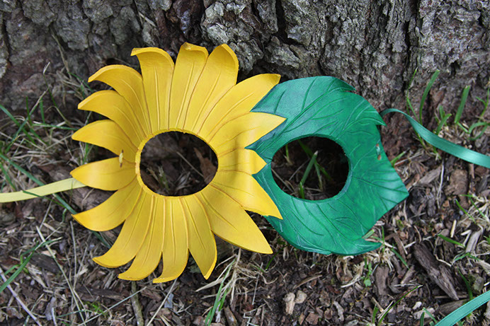 A cute mask with a radiant sunflower blossoming over one eye! Hand-shaped from leather and painted with acrylics. Comes laced with yellow and green ribbons.