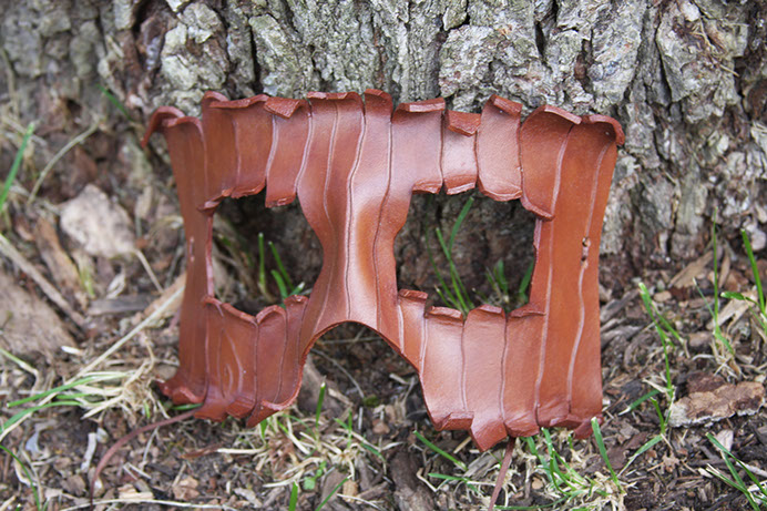 A mask resembling the peeling bark of an ancient tree! Hand-shaped from leather and painted with acrylics. This mask always turns out a bit unique, since the carving and peeling is never exactly the same from mask to mask. Comes laced with brown ribbons.