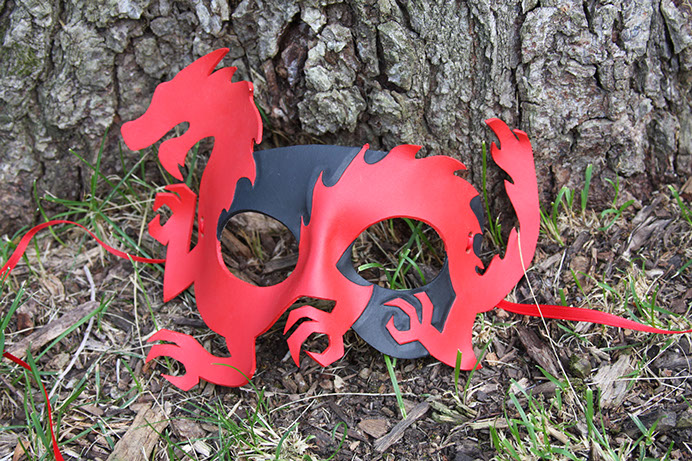 A beautiful mask featuring a silhouette of a Chinese dragon! This mask is definitely one of my favorite designs. Hand-shaped from leather and painted with acrylics. Comes laced with red ribbons.