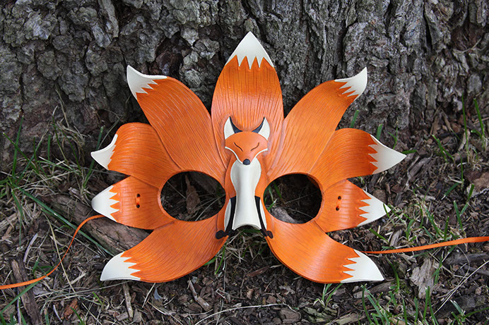 A beautiful mask in the shape of the mythical nine-tailed fox of east Asian folklore! Hand-shaped from leather and painted with acrylics. Comes laced with orange ribbons.